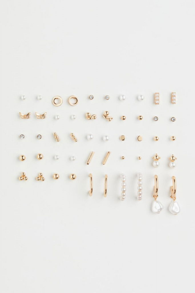 Studs av metall i olika utföranden, varav tre par dekorerade med strasslipade stenar i glas och nio par dekorerade med pärlemorskimrande pärlor i plast.