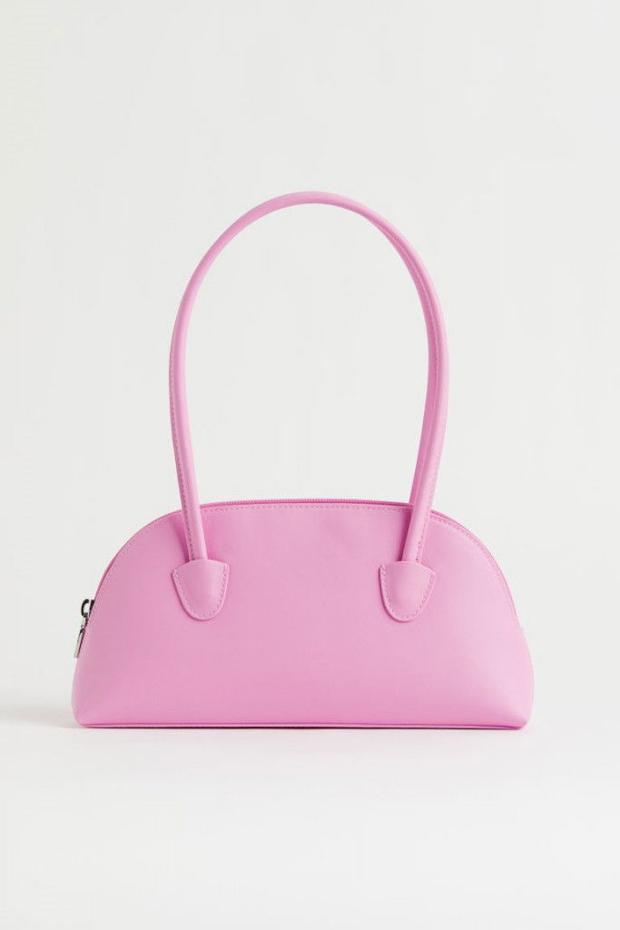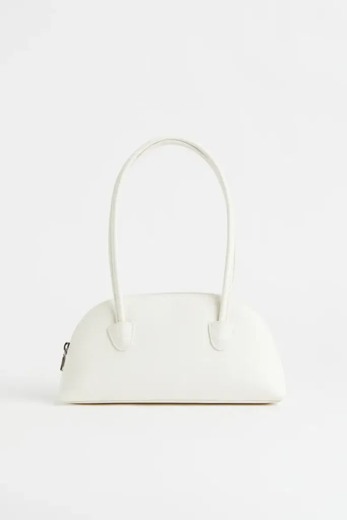 En bowler-väska i läderimitation med dubbla, långa handtag som gör att den kan bäras både som en handväska och som en axelremsväska. Väskan har dragkedja upptill. Fodrad. Höjd 13 cm. Bredd 27 cm. Djup 5 cm.