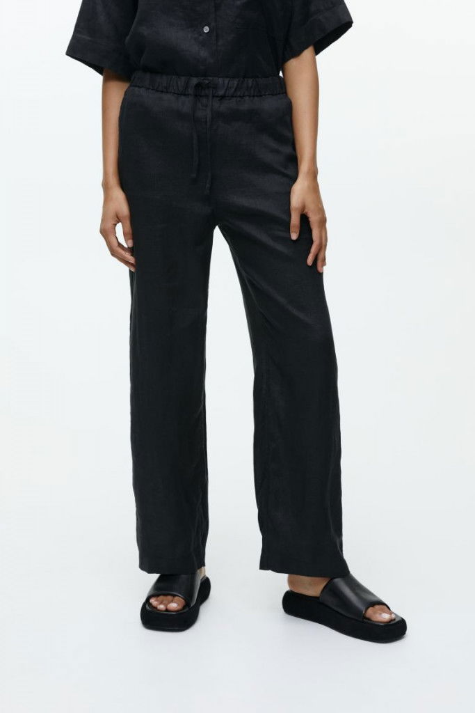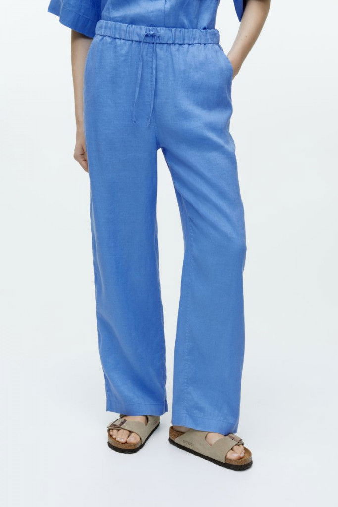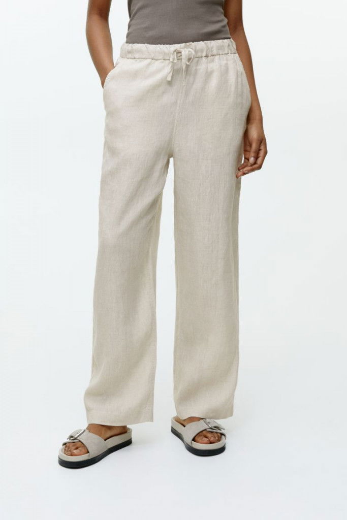 Beskrivning av Byxa i linne Byxor i linne för en luftig och bekväm känsla, med hellånga, raka ben. Resår och dragsko i midjan Snedställda sidfickor