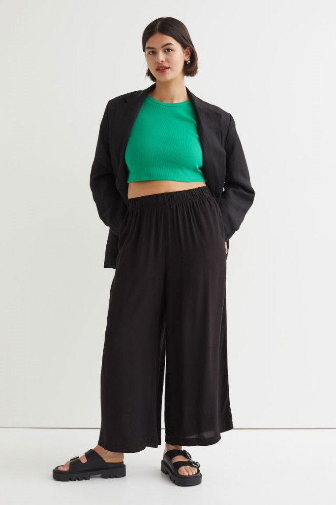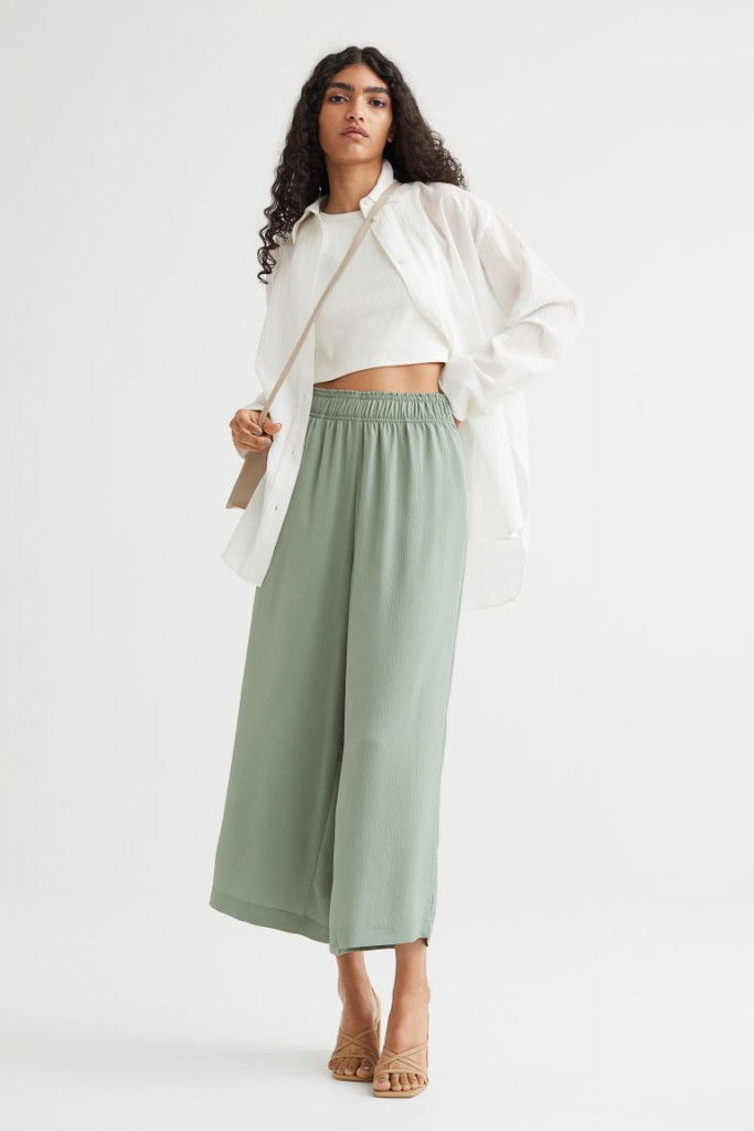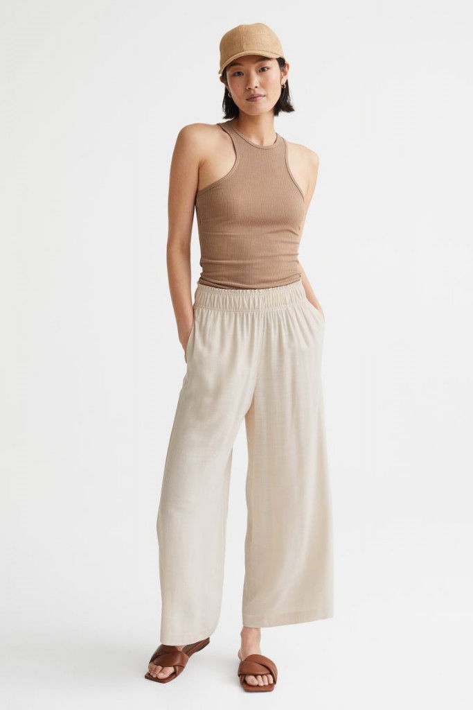 Ett par ankellångabyxor i följsam, vävd viskos. Bycorna har hög midja med resår och raka, vida ben. Diskreta fickor i sidsöm.