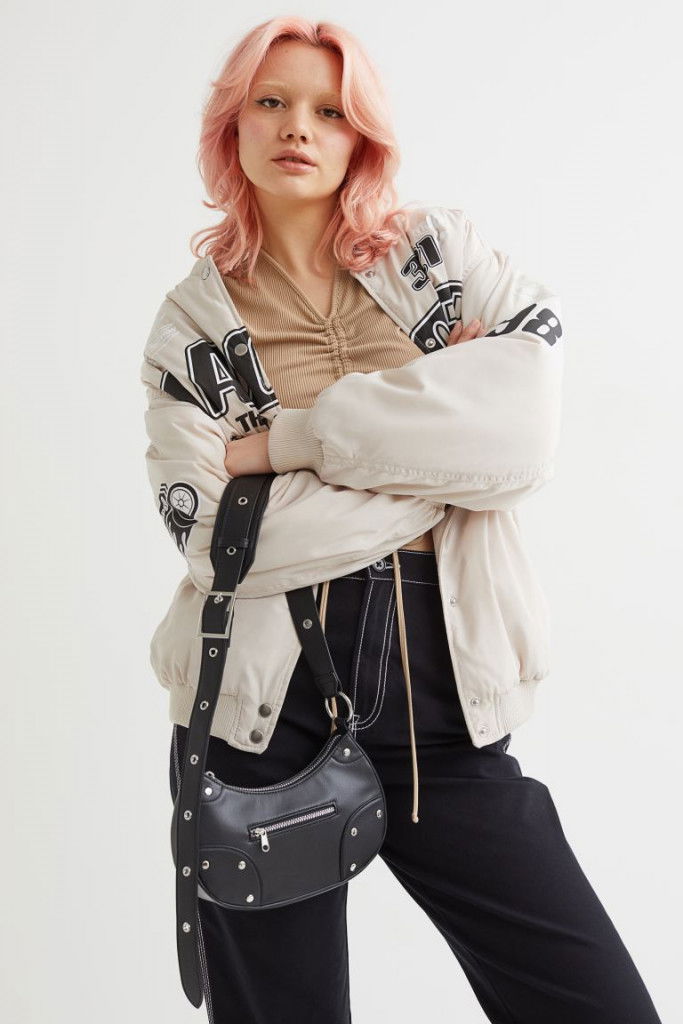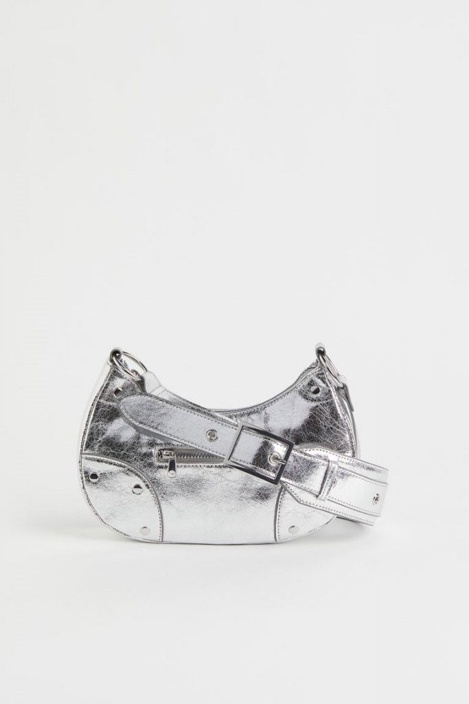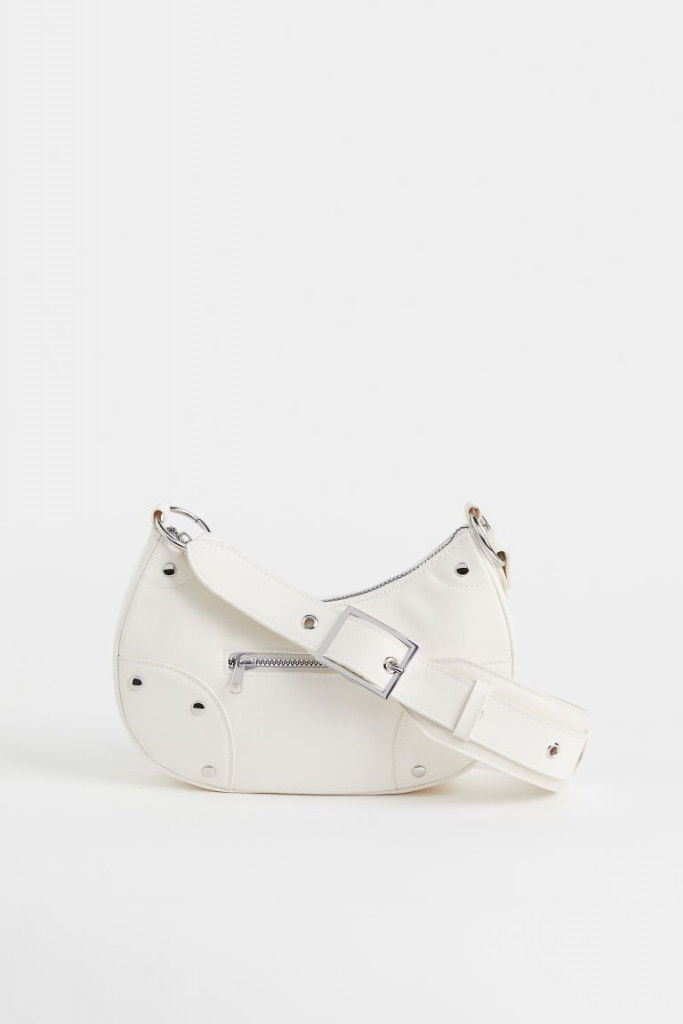 En liten väska i läderimitation med nitar. Väskan har reglerbar axelrem med metallspänne och försluts med dragkedja upptill. Framfack med dragkedja. Fodrad. Djup nedtill 5 cm. Höjd 12 cm. Bredd 21 cm.