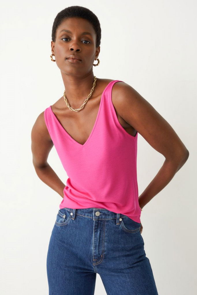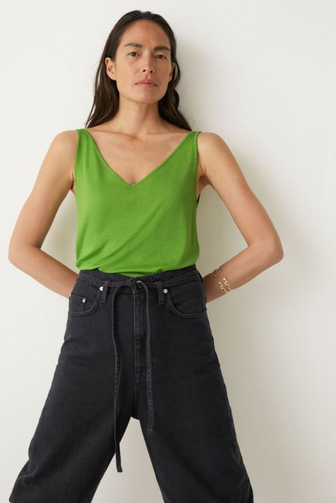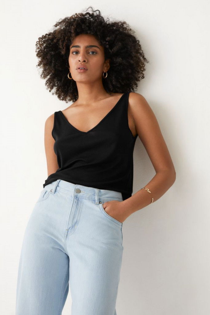 Beskrivning av Ribbad V-ringad topp En ribbad ärmlös topp med avslappnad passform och djup V-ringning. TENCEL™ LYOCELL Längd: 61 cm (EU 36)