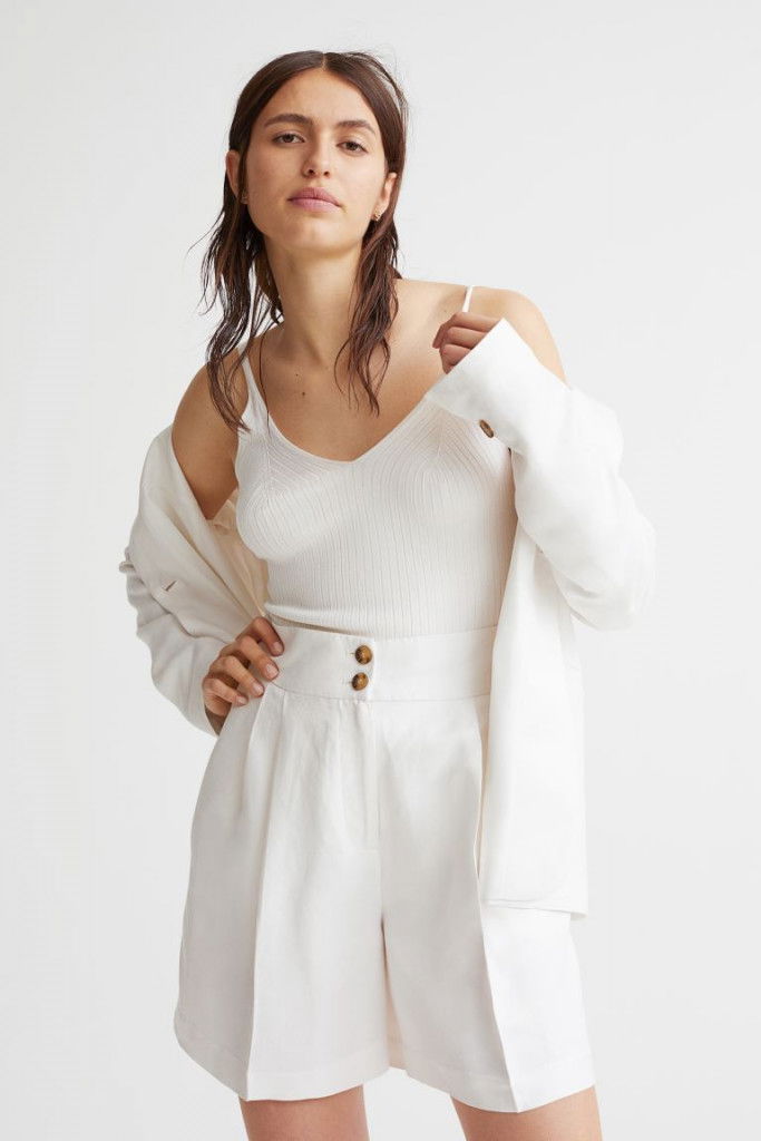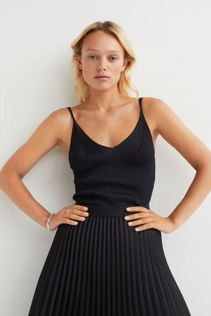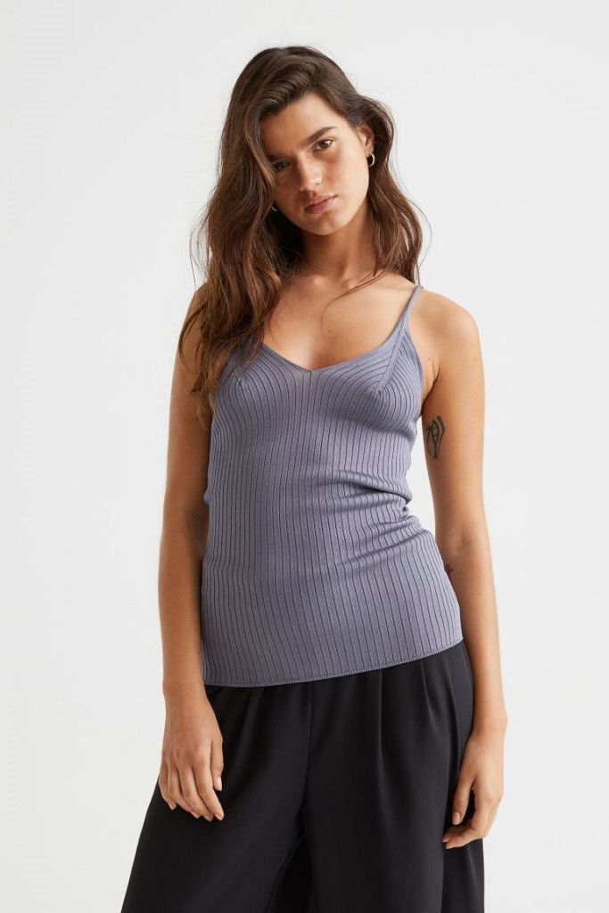 Beskrivning av Ribbstickat linne Ett figurnära linne i ribbstickad viskosblandning med v-ringning fram och bak.