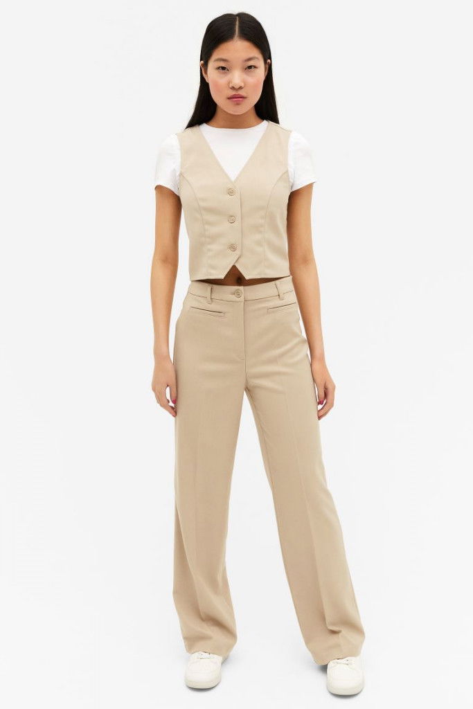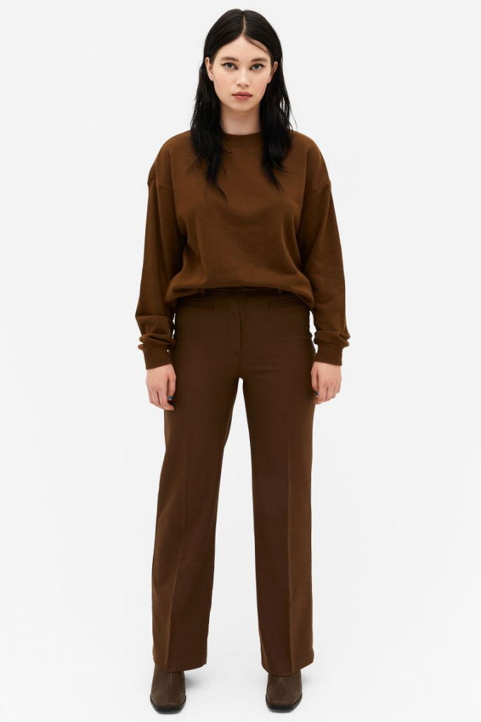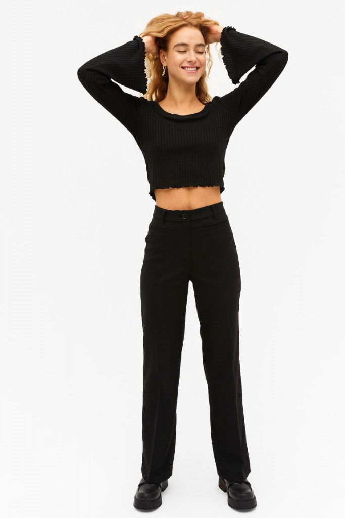 A pair of black high waist structured trousers. Classic and casual! Regular fit Straight leg Belt loops Back pockets and imitation front pockets Zip fly with button closure Made from recycled polyester In a size 38 the inseam is 79 cm.