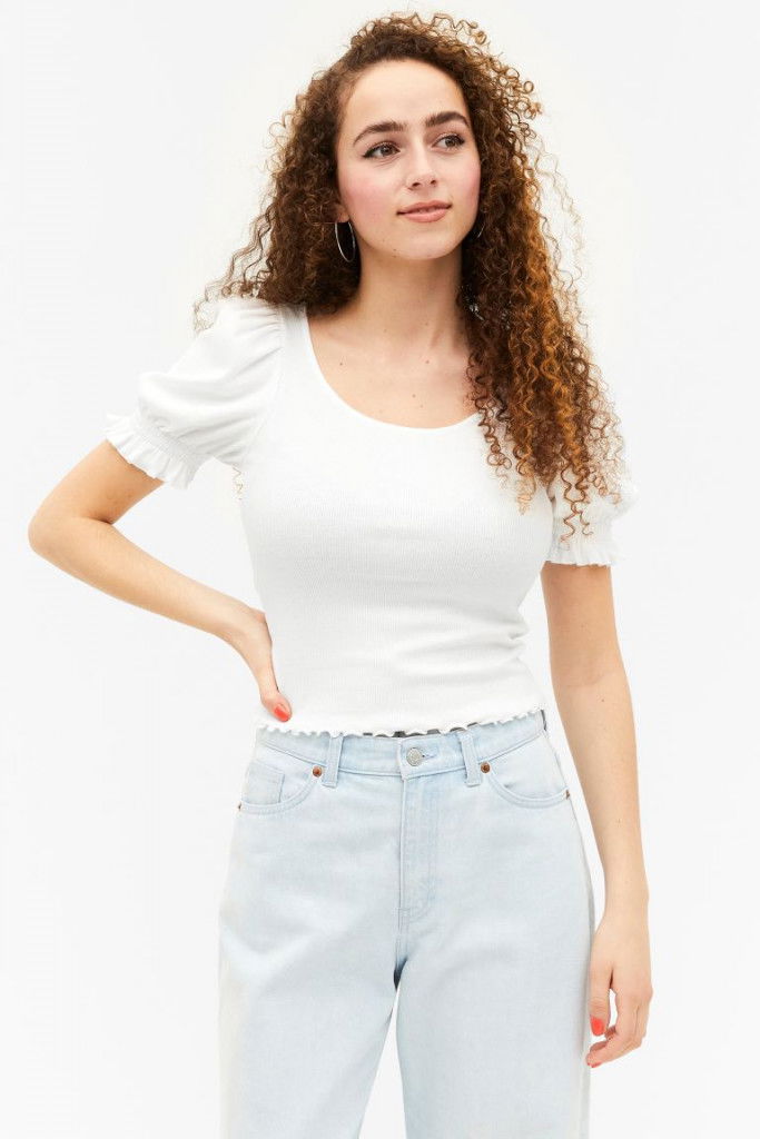 Uppgradera basgarderoben med en kortärmad vit topp i ribbstickad kvalitet med rund halsringning och söta uddkanter <3 Klassisk längd. Smal passform. I storlek S är bröstvidden 70 cm och längden 48 cm.
