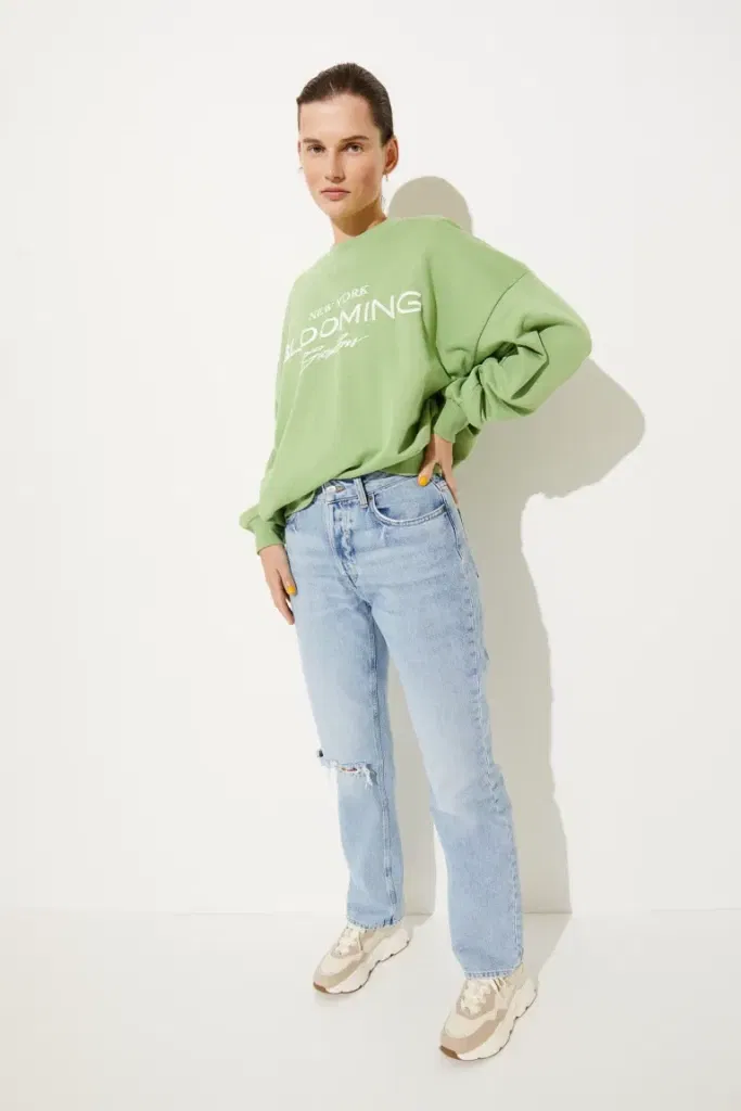 Beskrivning av Tröja med raglanärm En tröja i mjuk bomullstrikå. Tröjan har rund halsringning och lång, vid raglanärm. Ribbad mudd vid kring halsringning, vid ärmslut och nedtill.