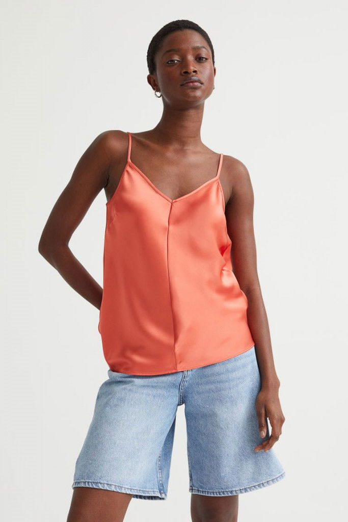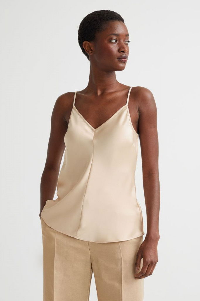 Beskrivning av V-ringat satinlinne Ett a-linjeskuret linne i följsam satin med smala axelband. Linnet är v-ringat fram och bak.