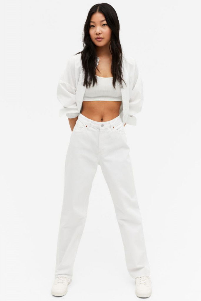 High on the waist, a little extra room on the thighs and non-stretch. This pair of throw back babes are straight leg and ready to be rolled up for fun. Loose fit. High waist. Full length. Straight leg. Non-stretch. In a size 28 the inseam is 79 cm. Monki tip: our customers say this style runs a bit big in size.